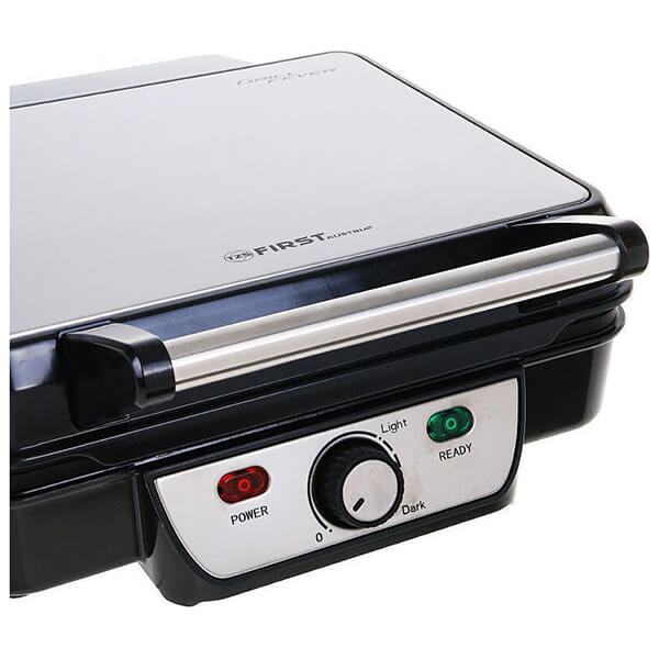 Τοστιέρα-γκριλιέρα της First Austria με ισχύ 1800W, αντικολλητικές πλάκες για εύκολο καθαρισμό και ειδικό δοχείο για απομάκρυνση του λίπους. Ανοίγει σε 180 μοίρες για να μπορείτε να ψήσετε άνετα κρέας ή λαχανικά, ενώ ο θερμοστάτης ελέγχει την θερμοκρασία του ψησίματος.