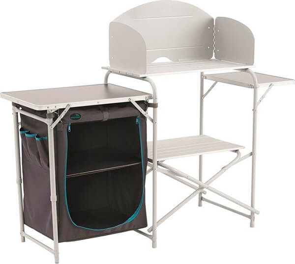 Το τραπέζι κουζίνας Easy Camp Sarin παρέχει σταθερότητα για την προετοιμασία και το μαγείρεμα των τροφίμων και ένα τέλειο μέρος για να αποθηκεύετε κατσαρόλες, τηγάνια, σκεύη και τρόφιμα κοντά σας. Διαθέτει σταθερό ατσάλινο σκελετό, δύο βοηθητικά τραπεζάκια και ντουλάπι με ράφια. Το τραπέζι είναι απλό στη ρύθμιση και τοποθετείται στη δική του τσάντα μεταφοράς και αποθήκευσης. Χαρακτηριστικά Αντοχή: 30 kg.Υλικό: σκελετός από χάλυβα/αλουμίνιο, πλαστικοποιημένο επάνω μέρος.Διαστάσεις: 143 x 48 x 110.5 cm.Βάρος: 9.4 kg.Χρώμα: Λευκό.Εγγύηση: 2 χρόνια.