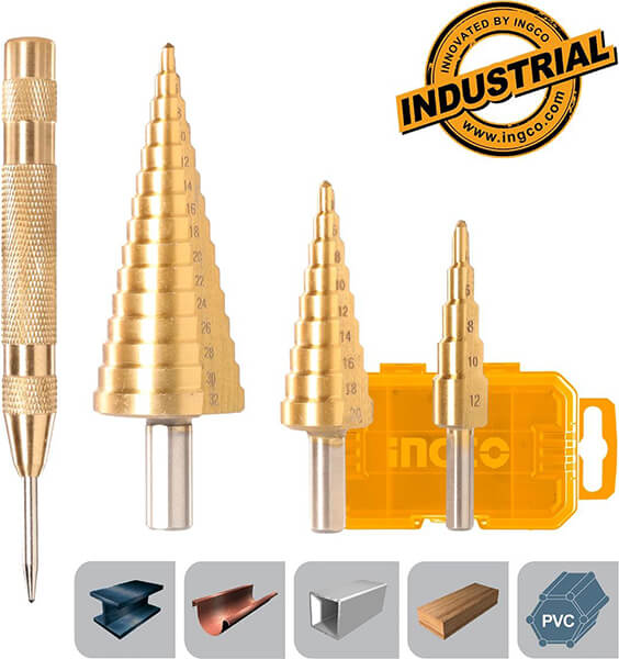 • Περιεχόμενα συσκευασίας: 1 τεμ. Τρυπάνι 4-12 mm με Φ 6 mm, 1 τεμ. Τρυπάνι 4-20 mm με Φ 8 mm, 1 τεμ. Τρυπάνι 4-32 mm με Φ 10 mm, 1 τεμ. Αυτόματη πόντα, Πλαστική κασετίνα.