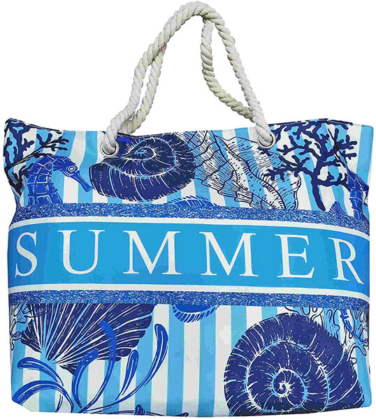 Τσάντα παραλίας με επιγραφή ''SUMMER'' και σχέδια κοχύλια.