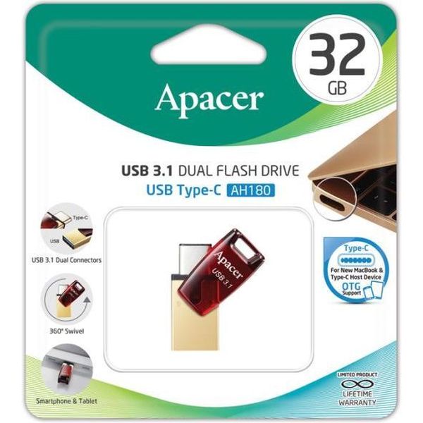 USB STICK APACER AH180 32GB USB 3.2 GEN 1/USB-C ΚΟΚΚΙΝΟ (PER.271701)