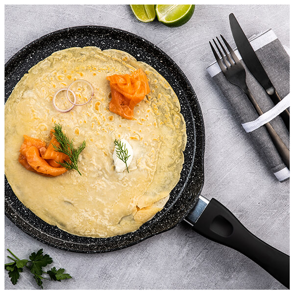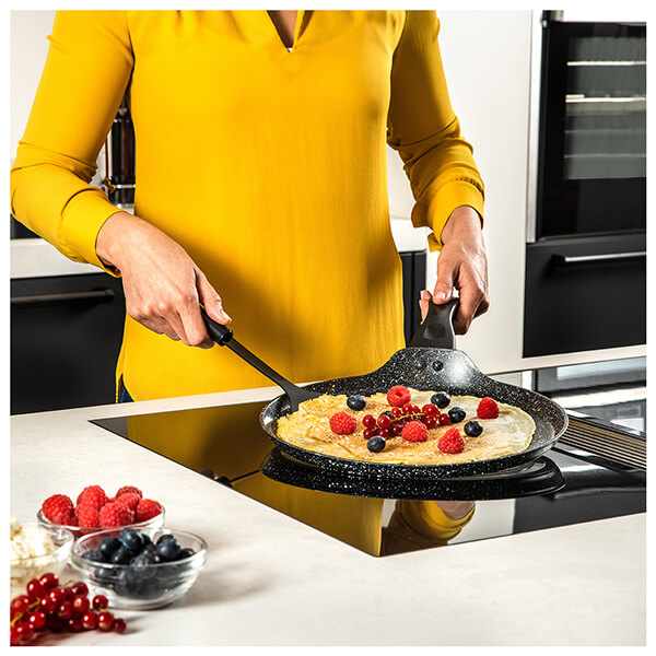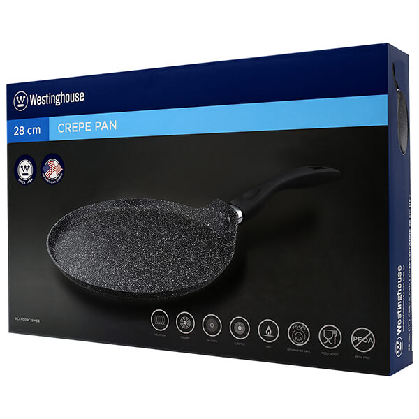 Αντικολλητική κρεπιέρα (28 cm) Black Marble Series από την Westinghouse! Ενισχυμένη με διπλή επίστρωση μαύρου μαρμάρου, πρόκειται για ένα ιδιαίτερα χρηστικό σκεύος, ιδανικό για λεπτές και αφράτες κρέπες! Είναι κατάλληλο για χρήση σε κάθε εστία, ενώ καθαρίζεται εύκολα και γρήγορα, είτε στο χέρι είτε σε πλυντήριο πιάτων. Τέλος, το κομψό, high-end design, σε συνδυασμό με την εντυπωσιακή συσκευασία της.