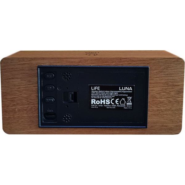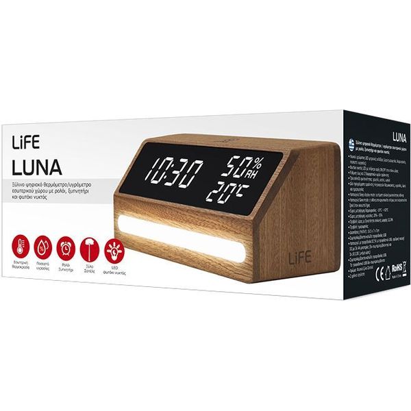 LIFE στην κατηγορία ΡΟΛΟΓΙΑ Το ξύλινο ψηφιακό θερμόμετρο/υγρόμετρο εσωτερικού χώρου Life Luna με ρολόι, ξυπνητήρι και φωτάκι νυκτός συνδυάζει κομψότητα και λειτουργικότητα. Σας ενημερώνει για την ώρα, την ημερομηνία, αλλά και για την τρέχουσα θερμοκρασία και υγρασία του χώρου σας, προσφέροντας πρακτικότητα και άνεση για κάθε δωμάτιο.