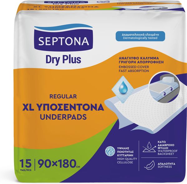 Τα υποσέντονα SEPTONA Dry Plus REGULAR, προσφέρουν γρήγορη απορρόφηση και προστασία χάρη στην υψηλής ποιότητας κυτταρίνη που διαθέτουν και είναι ιδανικά για περιπτώσεις ακράτειας και μετεγχειρητικές καταστάσεις. Διαθέτουν άνω κάλυμμα με απαλή υφή και ανάγλυφη επιφάνεια, ενώ το κάτω αδιάβροχο στρώμα τους βοηθά στο να μη γλιστρούν και να παραμένουν σταθερά στις επιφάνειες.